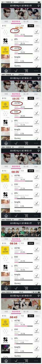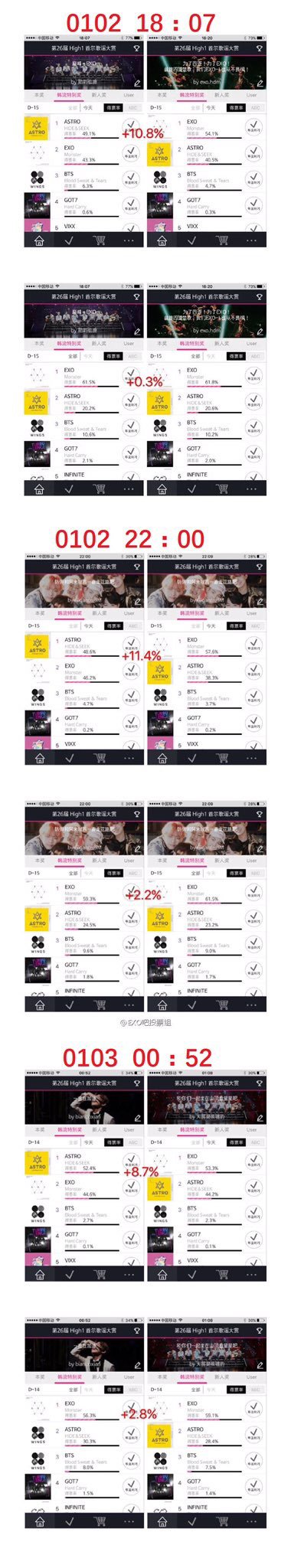 중국 서가대 투표앱 시간별 투표율 변화=1분만에 3위가 치고올라와서⬆50%이상 으로 역전,심지어 엑소는 20분만에 투표율떨어짐⬇
