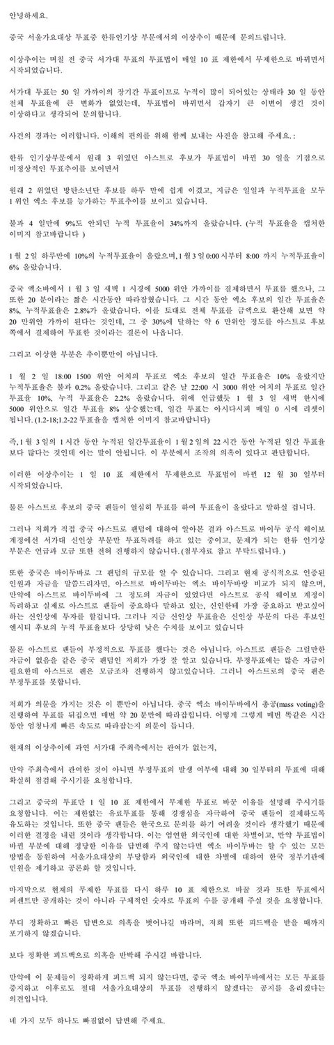 이렇게 지금 서가대 투표 조작에 대해 트위터랑 페북에서 난리가 나고있음. 이 글은 논란이 되고 있는 신인그룹 아스트로를 목적으로 한 글이 절대 아님을 밝힘. 이건 서울가요대전 시상식 조작을 목적으로 한 글인을 명백히 밝힘. 그리고 그 팬덤도 인기상을 목표로 총공한적이 없다고 하니까 이건 명백한 시상식 측의 조작임이 틀림 없다는 주장임.