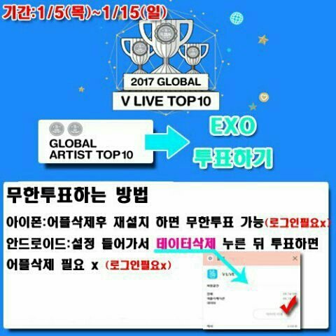데이터 삭제방법 환경설정 애플리케이션 관리자 가위앱 터치(V라서 밑부분에 있음) 저장공간 데이터 삭제 지금 차이 많이나니깐 엑소상줄라면 귀찮아도 투표하자