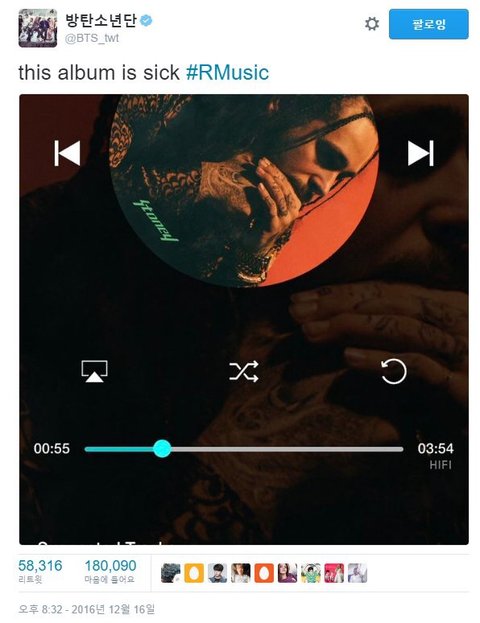 지난달 방탄과 post malone의 맞팔이 성사. RM뮤직이 계기인 것으로 추정