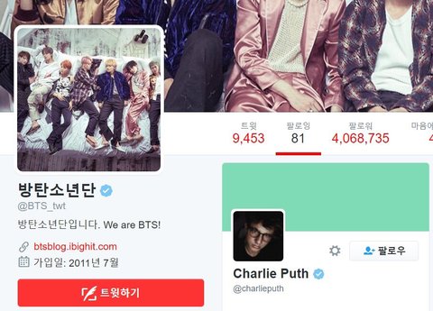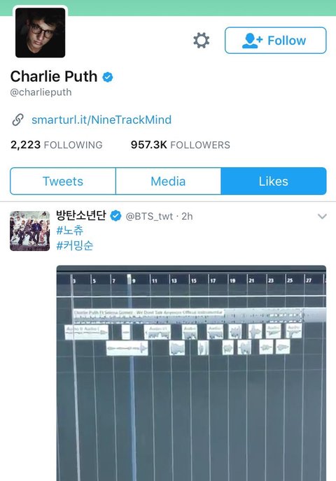 정국이 커버예고를 올린 후 원곡을 부른 Charlie Puth가 해당트윗에 좋아요를 누르고, 방탄을 팔로우.