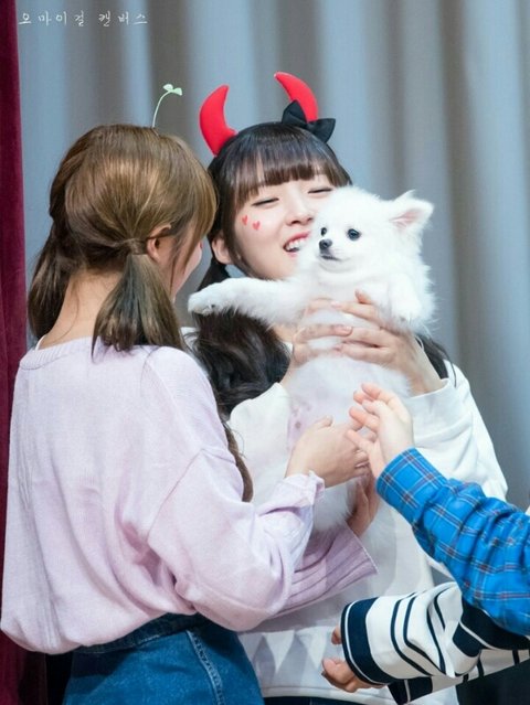 자꾸 오마이걸 멤버들이 만지고 뽀뽀하니깐 지쳐보이기도 함 개념개상... 하지만 개념개상의 원조는