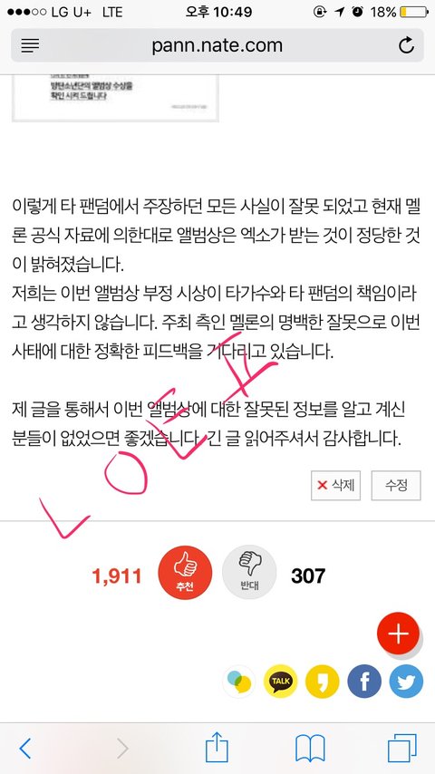 진짜 어제 고생 많았어 오늘도 계속 톡선 보고 댓글 관리 하는 것 같았는데 고맙다 ㅠㅠ 추천수도 높고 조회수도 높고 반대수가 많긴 해도 많은 머글들이랑 타팬들도 오해 풀고 다들 고생했고 멜론 통화 공지로 다시 보자~ 계속 톡선 관리하고 그리고 저 글 톡선 내려가기 전에 피드백 못 받을 것 같아 근데 어차피 반박할 자료가 없어 다 멜론피셜이니까 그냥 우린 지금처럼 계속 멜론 조지자 파이팅