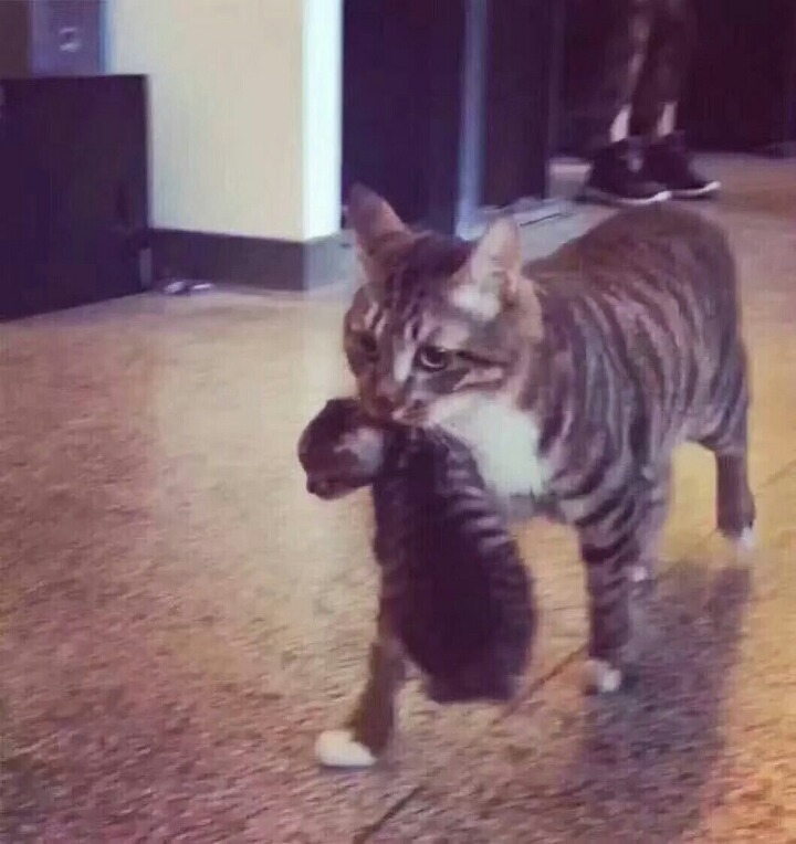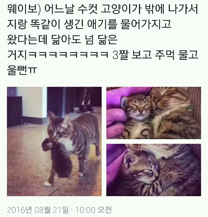 수컷 고양이가 지랑 똑같이 생긴 애기를 물어옴.twt