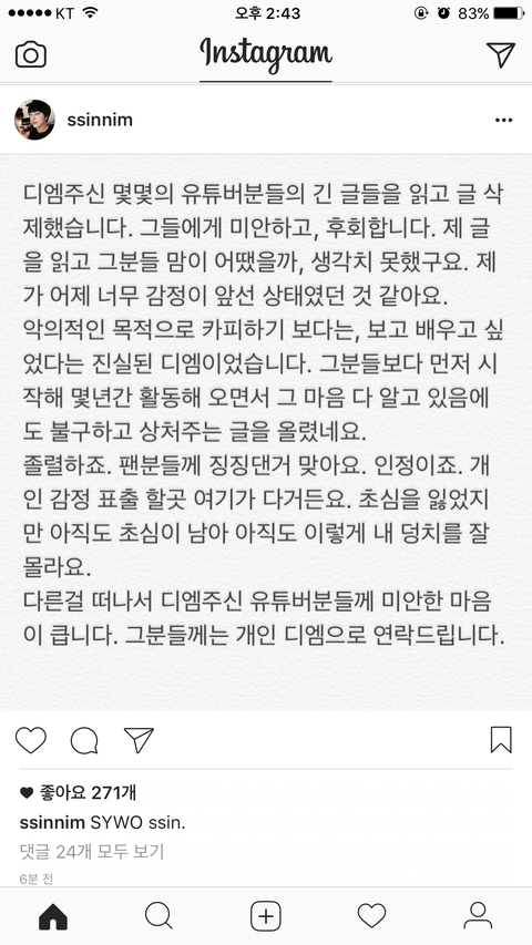 빙금 씬님이 인스타에 사과문을 올렸는데 나는 왜이글이 그 레이아웃 카드를 자기가 창작한게 아니라 기본효과인데 자기 창작물처럼 썼는데 그분들에가 저격글을올려 죄송하다는 사과가 아니라 "그들이 내꺼를 배끼긴 했는데 완전한 카피가 아니라 내꺼를 보고 배우려고 참고를 한거래요 내가 초창기를 생각못하고 유튜브 선배로서 상처주는말을했어요" 이렇게 들리지..?? 그 정보카드를 아직도 자기스스로 만들었다고 생각하는것같아