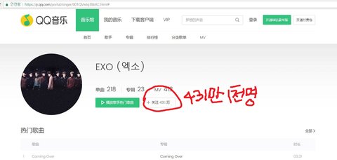 380만 공식 엑소엘 외에도 중국의 멜론?급인 QQ뮤직에서 보면 약 430만명 이상이 엑소를 관심등록?해놨다는 것을 알수 있음.(중국어쌤 말로는 엑소 노래를 즐겨듣는 일반인과 팬 사이쯤이라네)