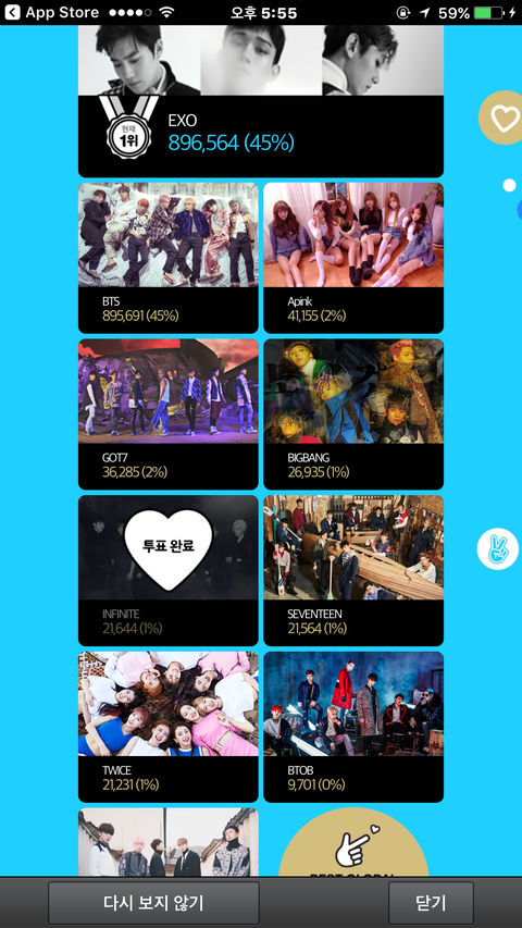 투표계속하는데 몇시간전이랑 투표수가 같아. 하루에한번잡계되나??아니면 로그인안하고 투표하면 투표수반영안되나...답답하다 ㅠ그래도 투표수가 1,2개라도 올라가야하는데. 고대로야