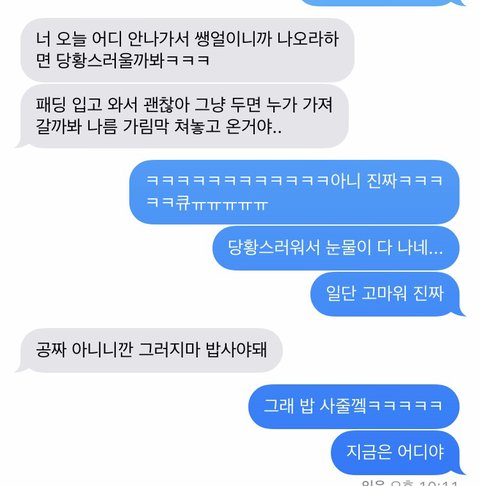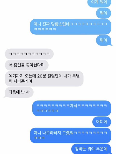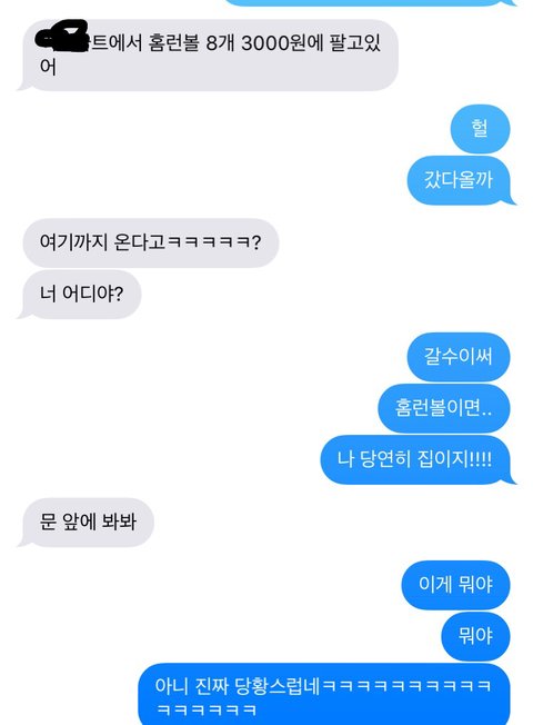 내가 진짜 홈런볼 좋아하는데 얘가 그걸 안단말이야ㅋㅋㅋㅋㅋㅋ 근데 우리집이랑 좀 먼 마트에서 엄청 싸게 판다길래 갈까라고 하니깐 여기까지 올꺼냐면서 집이냐고 묻길래 집이라고 하니깐 몇분 답장이 없었는데 그게 홈런볼을 사서 우리집 오는 시간이였나봐ㅌㅋㅋㅋㅋㅋㅋㅋㅋㅋㅋㅋ 진짜 처음에 당황해서 문 앞에 놓인 것 보고만 있다가 내가 이런 것 당해본 적도 처음이고 남자한테 뭘 받는다는 것도 처음이라 진짜 펑펑 울다왔어ㅋㅋㅋㅋㅋㅋㅋㅋㅋㅋㅋㅋㅋㅋㅋㅋㅋㅋ