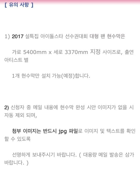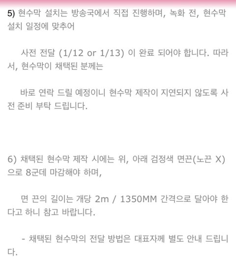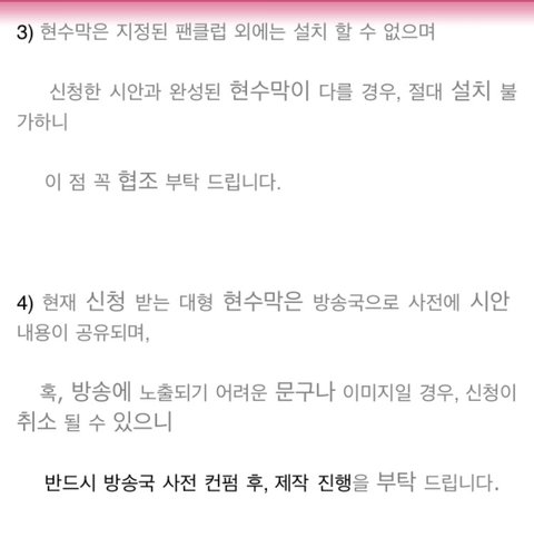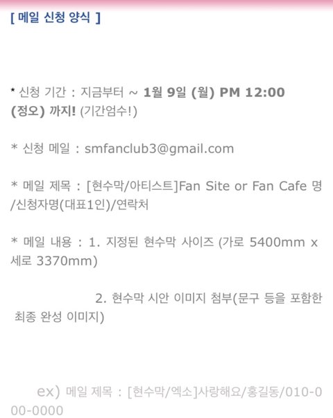 sm 측 공지를 따르면 현수막 셀렉 후에 담당자에게 연락이 올 것이라고 했습니다. 현재 제 계획은 담당자에게 연락이 온 후, 공지 받은 대로 현수막 제작을 업체에 맡길 계획입니다. (현재 현수막 제작 업체를 몇 군데 찾아보고 있습니다. 이 부분에 있어서는 정확하게 결정된 것이 없어 나중에 따로 공지해드리겠습니다.)