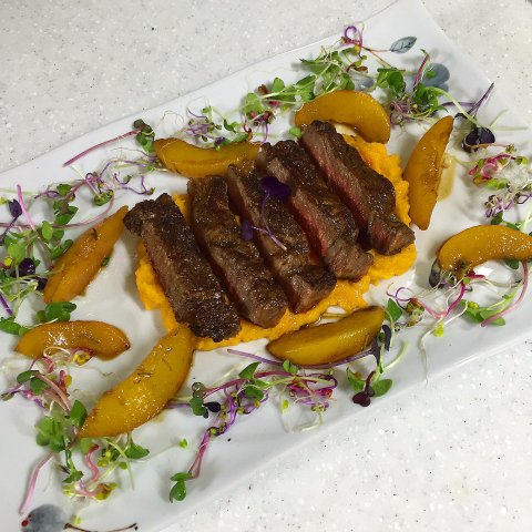 1. 꽃등심 스테이크1++ 등심을 가지고 만든 스테이크에요! 밑에는 단호박 퓌레를 만들어서 깔고, 잘 구어진 고기를 올렸어요! 고기를 굽고난 펜에 슬라이스 황도를 살짝 구워 곁드렸어요.원래 소고기맛을 잘몰랐는데,, 먹다보니 역시 소고기가 최고네요! 짱짱맨,,