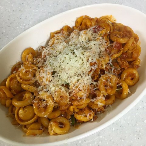 카펠레티란 면을 이용해서 만든 토마토 파스타에요. 소스는 다미코 소스를 이용하여 만들었습니다. 카펠레티면은 모자 모양의 면으로 파스타면 중 하나에요.