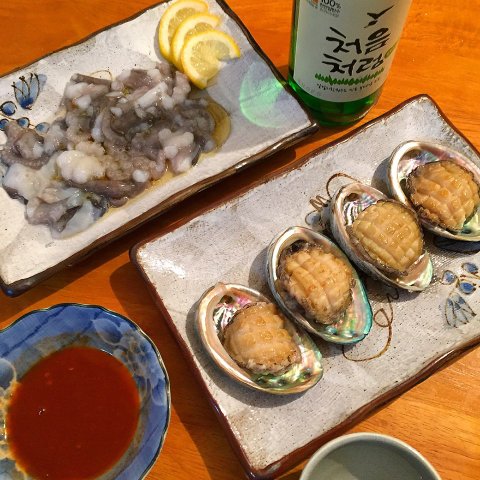 회사에서 받아온 산낙지와 전복을! 싱싱하게 산낙지 그리고 전복은 버터에 노릇노릇하게 구워서 쏘주 한잔 크!!!!!!!!