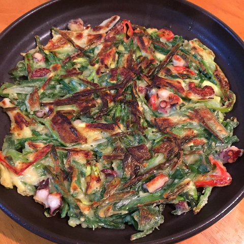 쪽파는 없고 대파는 있어서 대파랑 부추를 넣고~ 문어도 넣고~만든 파전이에요!!!