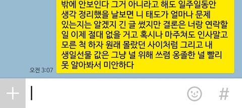 ㅅㅂ너무 착하냐? 사실 조카 쌍욕 쓰면서 끝내고 싶지만 침착하게 얘기하려고 애썼음 내가 스트레스 받은 게 많아서 그런지 막상 끝내려고 해도 눈물 하나 안나오네