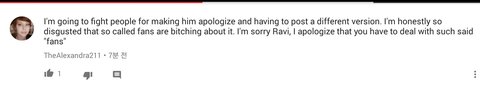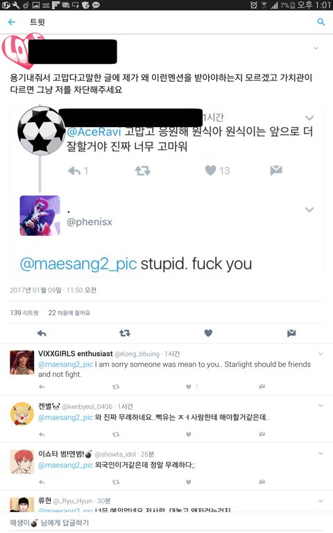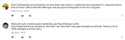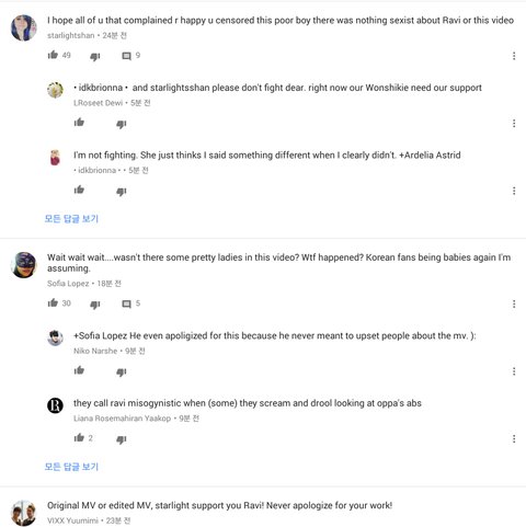 해외팬들은 한국팬들 어리고 질투많고 멍청하다 이런 생각들 갖고 있는 것 같은데 너무 어이없고 우리가 생각없이 뮤비 여자모델들 지워달라 한 게 아니라 라비한테 피해갈까봐 심사숙고를 하고 내린 결정인데 뭣도 모르면서 함부로 한국팬들 깎아내리는게 너무 보기싫고 뮤비댓글은 라비도 볼 수 있는건데 거기에다 대고 wtf explain now korean starlight! 이런 댓 써놓은 외퀴들 많아서 빡쳐 죽을 것 같다.