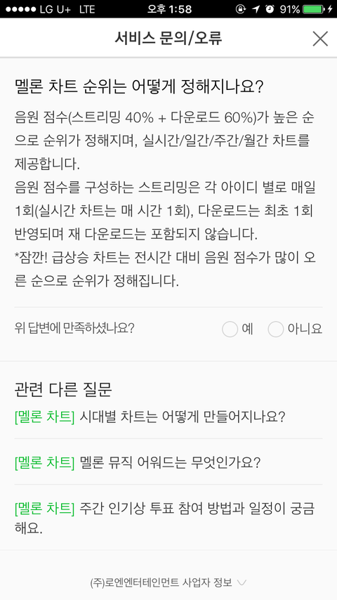 상담사: 홈페이지에서 고객센터에 들어가 검색란에 월간이라고 검색하시면 멜론차트는 어떻게 반영되는 건가요? 라는 질문 답변에 기재되어 있다고 합니다.