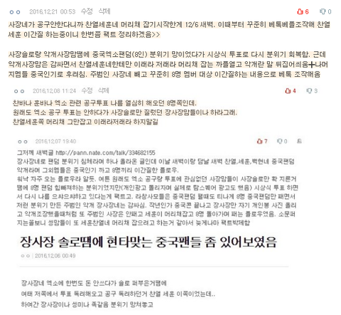 라창이니 먹금하고 직접 ㅊㅇㄷ보고와. 장사장쪽은 단순댓글도 아니고 글자체가 다 중국어로 도배되어있음. 1달전 사장네가 엑소 공구안한다고 했을때 애먼 찬열세훈 머리채잡아 주의돌리고 이간질 했던거처럼 사장맘 지들 쪽팔린거 묻으려 할때마다 애먼 8명 중에 머리채잡아서 베톡만드는게 수법이니까. 알아서 무시해ㅇㅇ ╋장사장네 엑소공구안한다 한 뒤 장사장 솔로 판매량으로 지하철 광고때림. 그래놓고 세훈네 머리채잡아 세훈쪽 까는 베톡만듦(딴멤까는베톡 만든뒤 결국 장사장공구광고 쉴드로 묻음). 그때 댓못달았어서 미안함. 여튼 요몇달 베톡추이(중국팬덤 세훈찬열쪽 머리채잡아 주의돌림╋딴멤들 중국인기 후려치며 8명이간질╋댓 자아분열)봐선 앞으로 ㅊㅇㄷ도 여태 봐온 라창 수법 그대로일듯하니 무시하길.