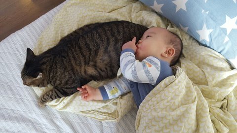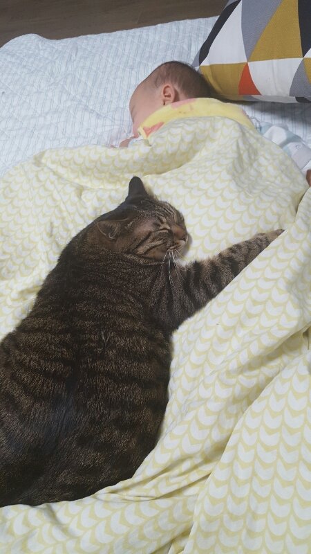 자는 아이를 베고 누워 버리는 랑이.
