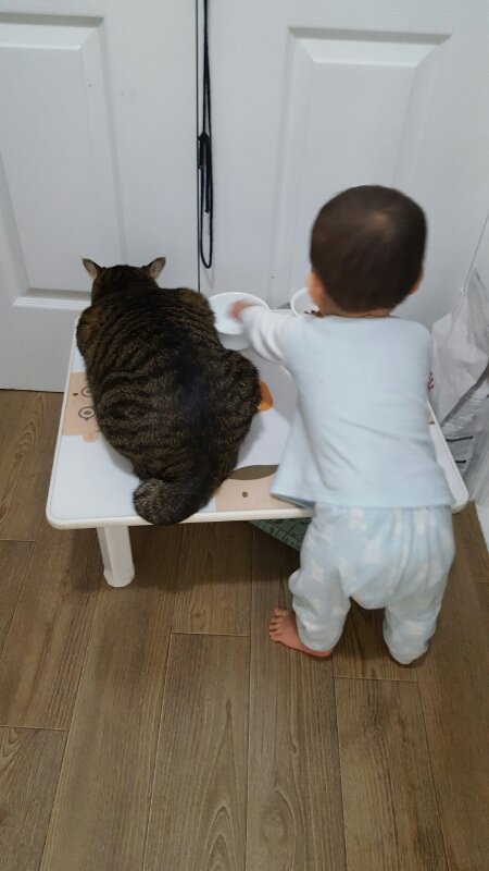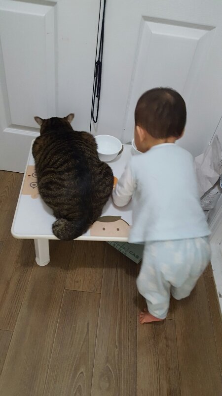 이아이가 냥이 밥 먹어봤게요 안먹어봤게요~