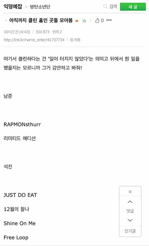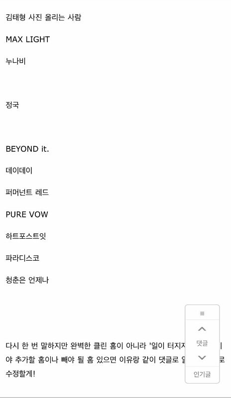그냥 클린홈같은거 올리지마 진짜 클린한줄 알잖아. 그리고 홈마들... 너희가 진짜 모르는건지 그냥 상관없는건지 모르겠지만... 물고빨고 하지마. 많이 기대도 말고. 너희가 물건 살때 사진이든 스티커든 빵빵하게 더 넣어준다고 좋은 사람아니고 너희가 쓴돈 다 애들한테 쓴다는것도 믿지 말고. 오늘도 이쁜사진 올려줘서 감사합니다. 하지마 지들끼리 쿵짝쿵짝 몰려다니면서 대리찍사 하는 애들 수도없이 많고. 콘서트 팬미팅 현장까지 가서 보지도 않는 애들도 있다고ㅋㅋㅋㅋㅋㅋㅋㅋㅋ