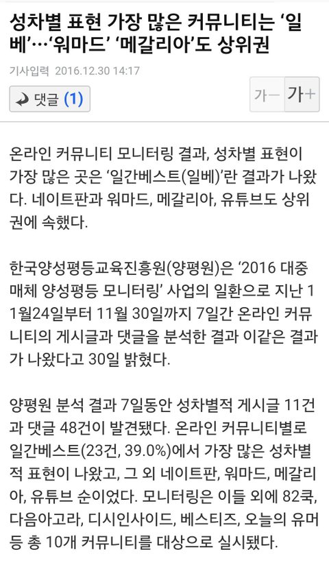 그런데 나는 솔직히 판이 남혐 안 했으면 사람들이 여성인권에 전혀 관심 안 가졌을 거라 생각함. 이렇게 꾸준히 이슈화 시키니까 여자들이 자기 인권 챙기고 그런거지 꼭 나쁘다고 생각할거 아님