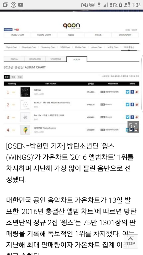 기사!!!가온 음반 앨범1위이이이이잉! 이거말고도