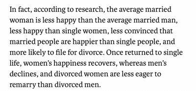 먼저 조사에 따르면 결혼한 여자는 결혼한 남자나 비혼한 여자보다 평균적으로 더 불행하고, 결혼이 비혼보다 행복하다고 믿지 않으며 이혼 소송을 걸 확률이 높다고 함