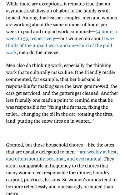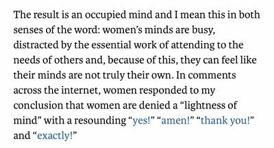 그래서 그러한 노동을 더 많이 하게 되는 여성은 자기가 아니라 남에게(ex.아이) 더 신경쓰게 되고, 정신이 없어져서 자기 마음이 항상 자기 자신을 신경쓰는 게 아니라 남만 신경쓰는 것처럼 느끼게 됨.