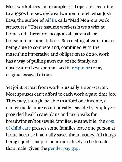 기업에서 사람들을 뽑아서 굴릴 때 이미 ^가장^이 일을 한다고 가정하고 일을 시킨다는 거다. 다시말해 이사람은 돈만 벌면 집안일을 해결해줄 와이프가 집에 있다는 가정 하에 업무량을 할당하는거. 그렇기 때문에 직장 안에서 경쟁 상대들보다 뒤쳐지지 않으려면 집안일에 참여를 안하고 그시간에 회사일을 최대한 많이 해야만 살아남을 수 있는 시스템.