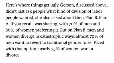 참고로 위쪽에서 중략된 내용인데, 동성애자 커플은 그럼 가사분배가 공정하게 되느냐? 그것도 아니야. 위에서 설명했듯이 밖에서 돈을 벌려면 회사에 완전 충성해야 된다니까. 결혼 자체가 한쪽이 희생할 수밖에 없는 구조임.