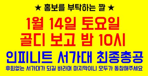열심히하는 잉토기들 수고했고 내일이 정말 마지막이야 내일 총공 있으니까 다들 참여해줬음좋겠고 10표 다하면 끝나는게 아니라 트위터 아이디 무한생성가능한거 다 알고있지? 계속 순발력하면 무한투표가능해! 진짜심각한 상황이라 안절부절하다 우리마지막에 역전당하면 다들 망연자실해있을것같아서 걱정도되고 8위랑 0.2퍼센트 차이밖에 안나 내일 충분히 저쪽에서 총공하면 그대로 떨어질 확률 높고. 그래서 지금부터 내일까지만 딱 하루라도 정말 열심히 투표해줫으면좋겠다 인피니트 일년동안 노력해온거 생각하면 줄수있는거 다줄수있는데 제일 힘쎈것도 상이고 제일 주기쉬운것도 상이니까 우리 해보자 힘내서 투표하고 지금까지 골든디스크 투표해줘서 고마웠어! 서가대는 남았으니까 열심히 해보자