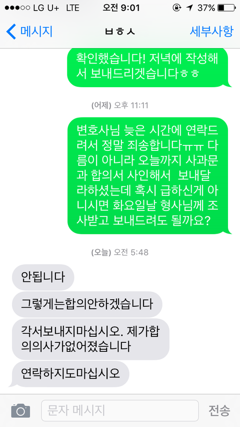 그래서 어젯 밤에 변호사님께 합의서에 사인을 오늘안까지 해달라 하셨는데 형사님께 조사받고 사인해서 다드리면 안됄까요 라고 문자를 보냈더니 오늘 아침에 문자오셔서 그렇게는 안됀다고 자기가 합의해줄 마음이 사라졌다고 연락하지말라왔더라군요...(사진 첨부) 제가 이런적이 처음이라서 원래 변호사분 계좌로 합의금을 넣고 조사도 받지않고 변호사님과 합의를 하면 고소 취하가 되는건가요???