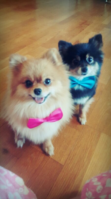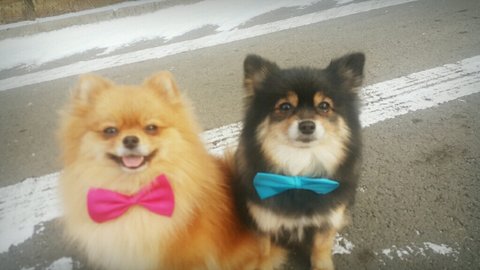 또치랑 둘리 서로 목에 리본 달고, 예쁜짓