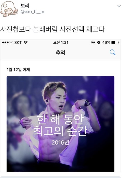 아이폰사진첩 기능중에 추억을 클릭하면 폰에서 자동적으로 최고의 순간이 뜨는데 그 많은 사진들을 제친 아이폰의 취향은 역시 민석이 보끈!!!! 이었다눈>.<