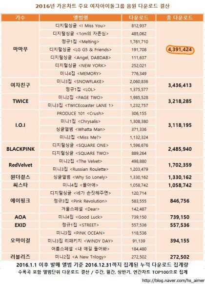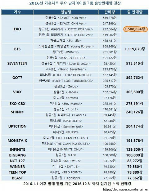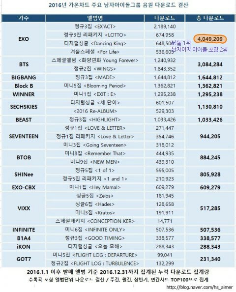 2016년 음원음반 매출 1위 엑소ㅇㅇ 음원 남녀 아이돌 중 2위