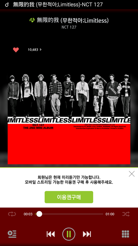 스트리밍 이용권?이 없어서 그런가재생이 1분밖에 안돼ㅠ 음원다운받은거에가서 재생목록에 담았는데도 이랭ㅠㅠ 스트리밍에 반영안되나...