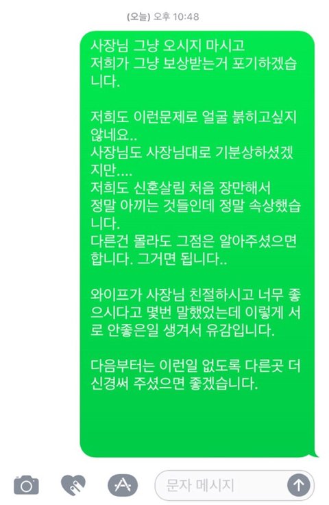 너무너무 속상하지만 일단 끝은 내야하기 때문에 남편과 함께 최대한 정중하게 문자 한통 보내고 끝냈습니다. ㅠㅠㅠㅠ