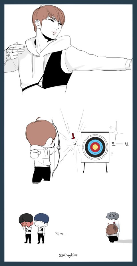 첫발 0점쏘고 믿을 수 없다면서 화살 가까이 감ㅋㅋㅋㅋㅋ 확인사살하니까 심장 부여잡고 주저앉음ㅋㅋㅋㅋㅋㅋ 두번째는 7점 쏘고 브이ㅇㅅㅇv하고... 세번째는ㅋㅋㅋㅋㅋ 쏘자마자 완전 텅!!!! 소리나서 바로 주저앉았음ㅋㅋㅋㅋㅋ누가 들어도 과녁에 맞은 소리는 아니었어.. 멤버들 뒤로 돌고... 그리고 계주 때 2등으로 치고 가다가 마지막에 뒹굴어서 꼴등했어ㅋㅋㅋㅋ 안 아프게 굴러서 다치진 않았는데 그걸 본 동생라인이 놀림ㅋㅋㅋㅋ 한 명은 택운이 부끄러워서 대기실로 바로 달려가는데 계속 놀리면서 따라감ㅋㅋㅋㅋㄱ
