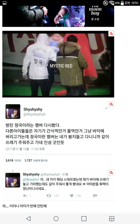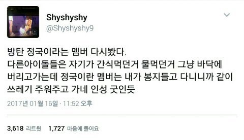 짹에서 주웠는데 아육대 끝나고인가 쉬는시간인가 스텦들 도와서 떨어진 쓰레기 주우러 다녔다고함. 이런건 카메라에 비춰지는 일도 아닐텐데 진짜 보기좋다