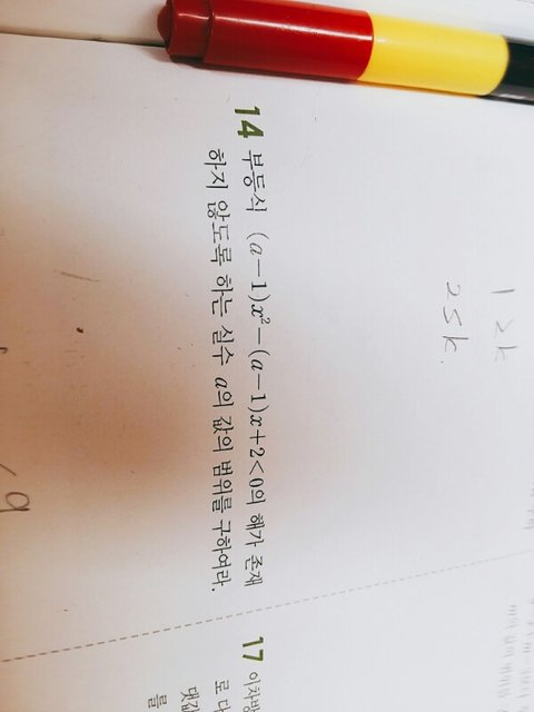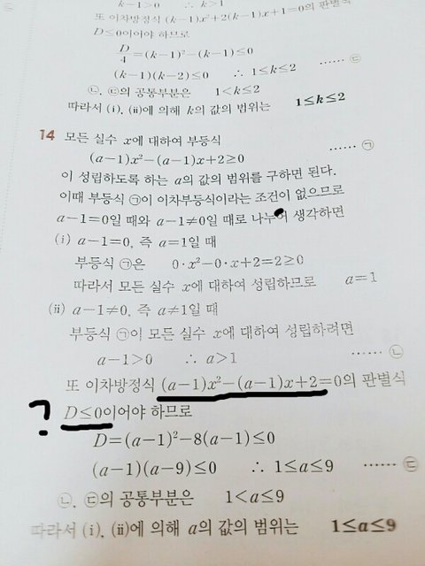 이 문제 풀이가 두 번째 사진이해가 존재하지 않으려면 D<0이라고 알고 있는데 왜 D는 0보다 작거나 같은지 모르겠어ㅠㅠ