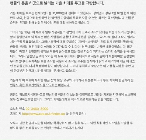 이번거 우선 뒤집고 나중에 팬들이 뭉쳐서 국회의원들 한테도 유료투표 금지하게 하는 법 만들어달라고 해야된다고 봐. 지금 도를 넘는게 해가 갈수록 더하고 인기에 집착 안 할수 없는게 모든 아이돌팬들인 건데 그 심리 이용해 먹는거 진짜 더러운 거고 앞으로 가면갈수록 더 심해질거임. 제발 다 같이 신고 제보 둘다 하러가자. 그냥 내버려두면 우리 영원히 고통받아야 돼. 아이돌 팬이라는 이유만으로. 진짜 다같이 끊어내자.