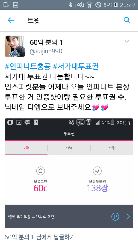 인피니트ㅊㄱ 으로 투표권 10장 보내줄 토기?
