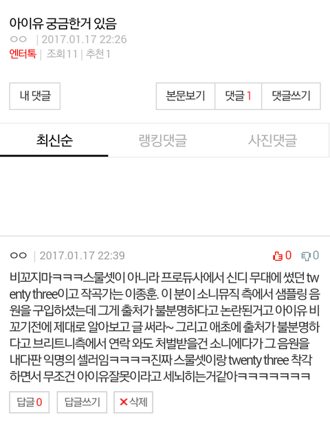 궁금한거 있다길래 들어가봤더니 아이유는 로리타때문에 브리트니 건 묻혔다고 비꼬면서 스물셋이랑 twenty three랑 구별도 못 하는 애가 지은이 욕하길래