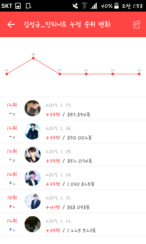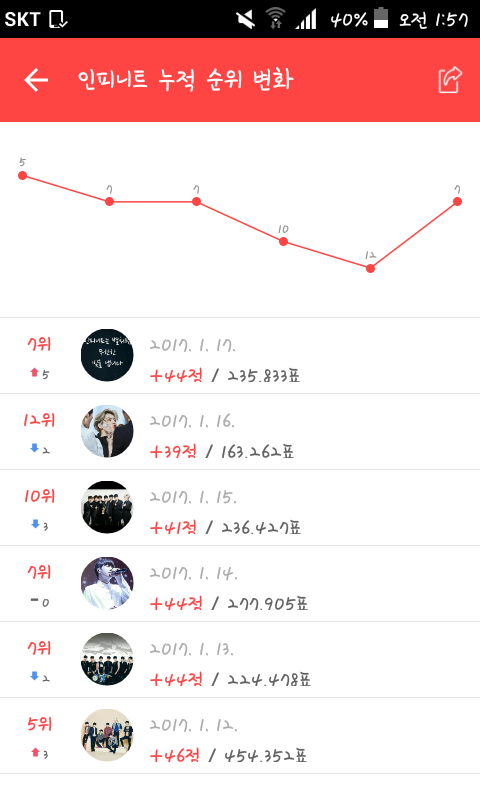 개인에서 가장높은게 성규꺼고 단체는 어제 7위로 올라간거같애!!이게 실제반영 기록이니깐 잘 참고해줘