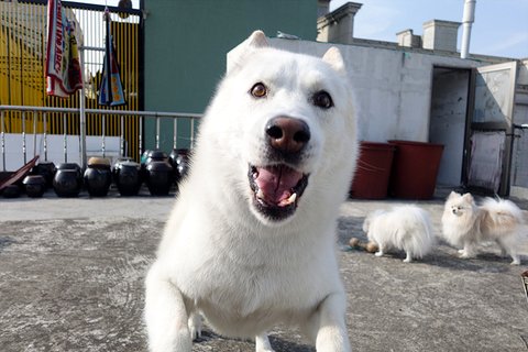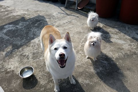 다른 큰개들 보고는 많이 짖는 콩이지만 심바한테는 짖질 않아요. 콩이가 어릴때부터 봐왔기 때문에