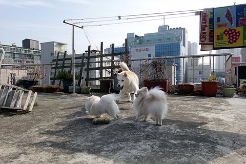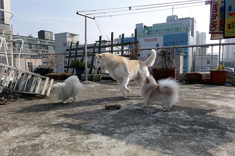 평소때는 꼬도리 꽃순이랑 잘 안놀아주는데. 옥상에 올라오면 같이 놀아주기도해요.