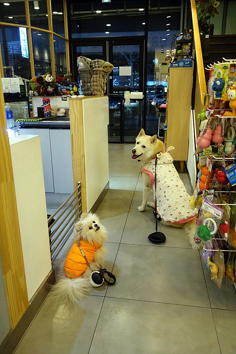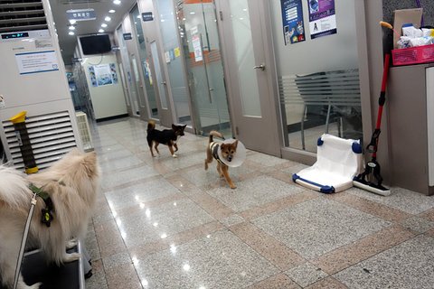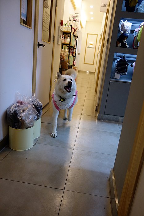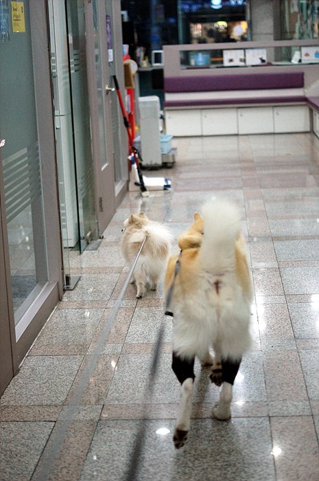 이제 산책하러 가자. 동물병원에 놀러와서 잠시 놀다가 동네 산책하러 나가는 중이에요.