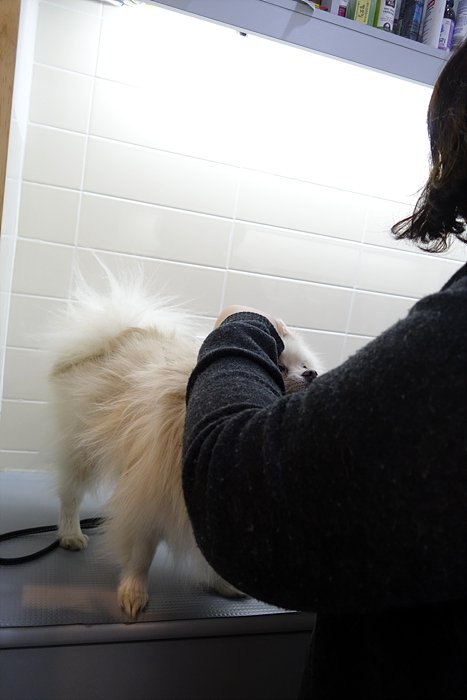 만수누나에게 미용 받고 있는 꼬도리, 꼬도리 귀가 털이 많이 자라서 너무 뽀족하다고..ㅋㅋ