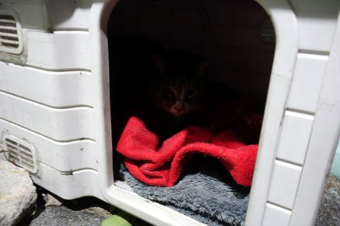 동물병원 놀러왔는데 동물병원 후문쪽에 길고양이 집을 쳐다보고 있어요.