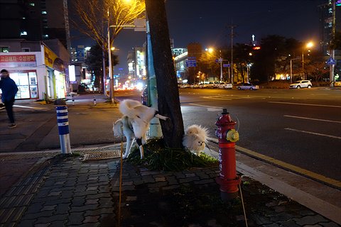 산책하면서 가로수에 마킹 양쪽에서 촤악 촤악